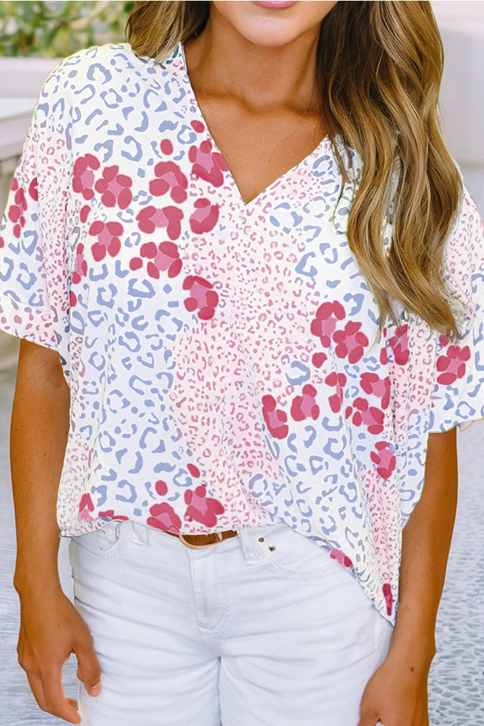 Mixed Leopard Print V Neck Short Sleeve Blouse